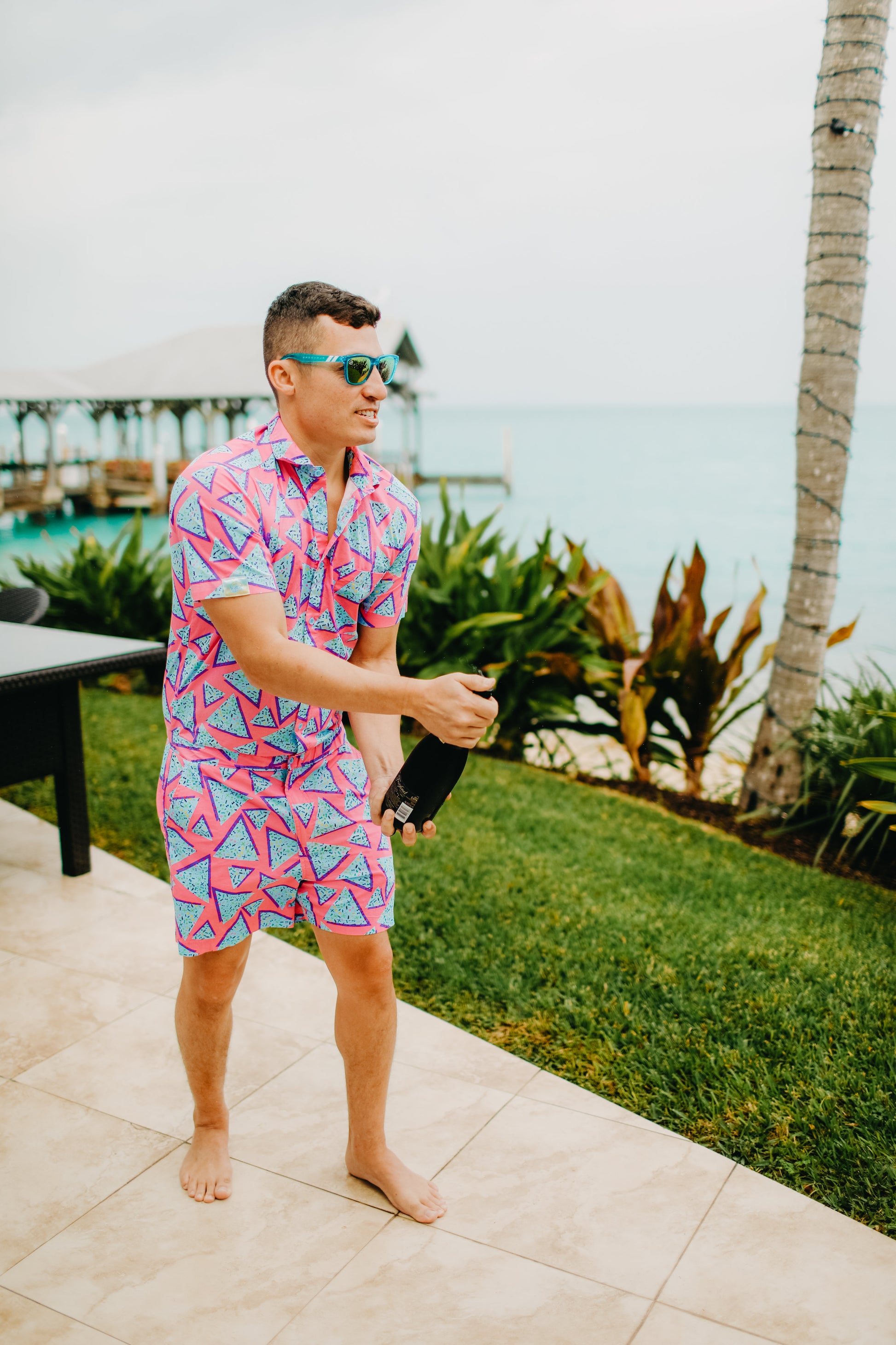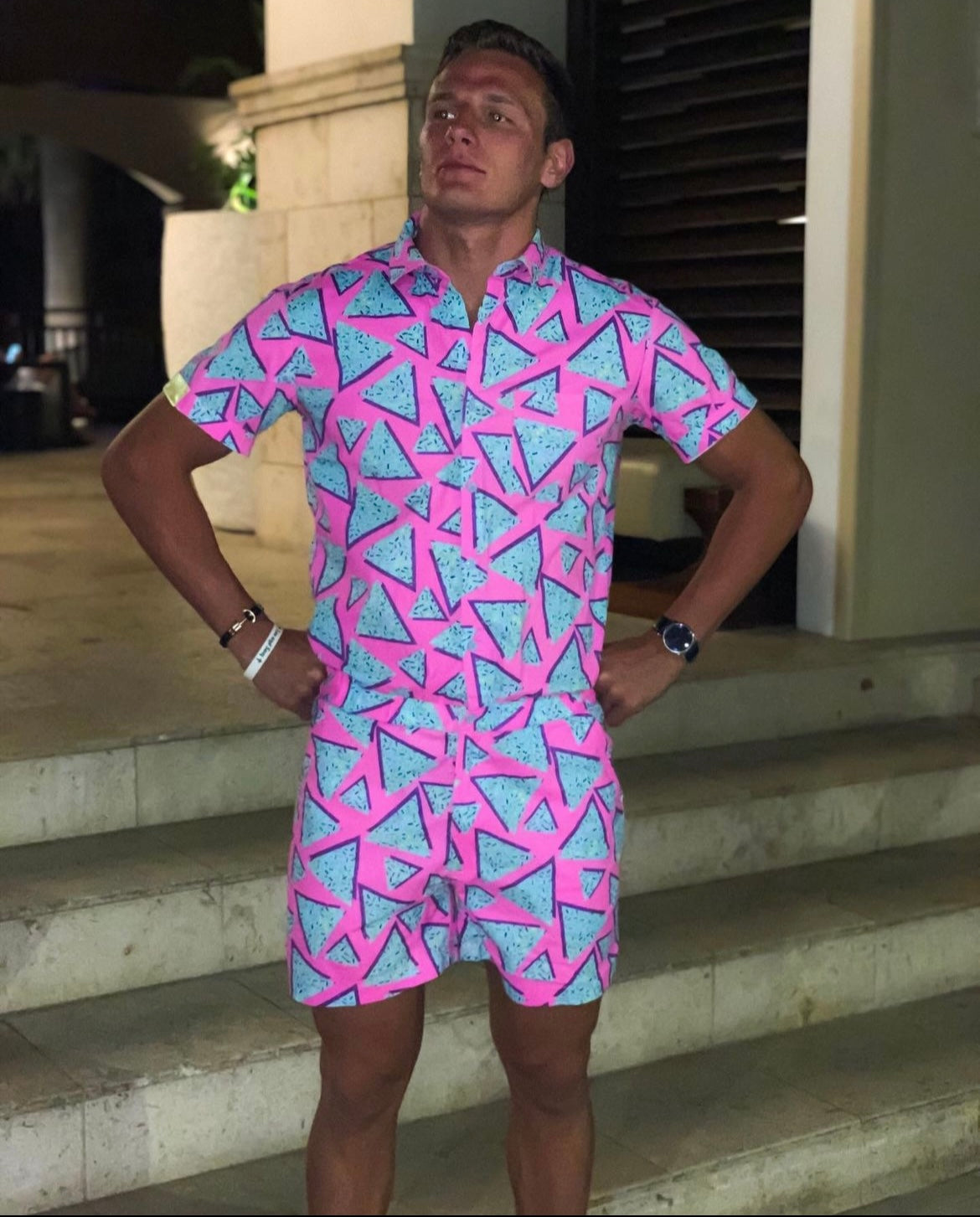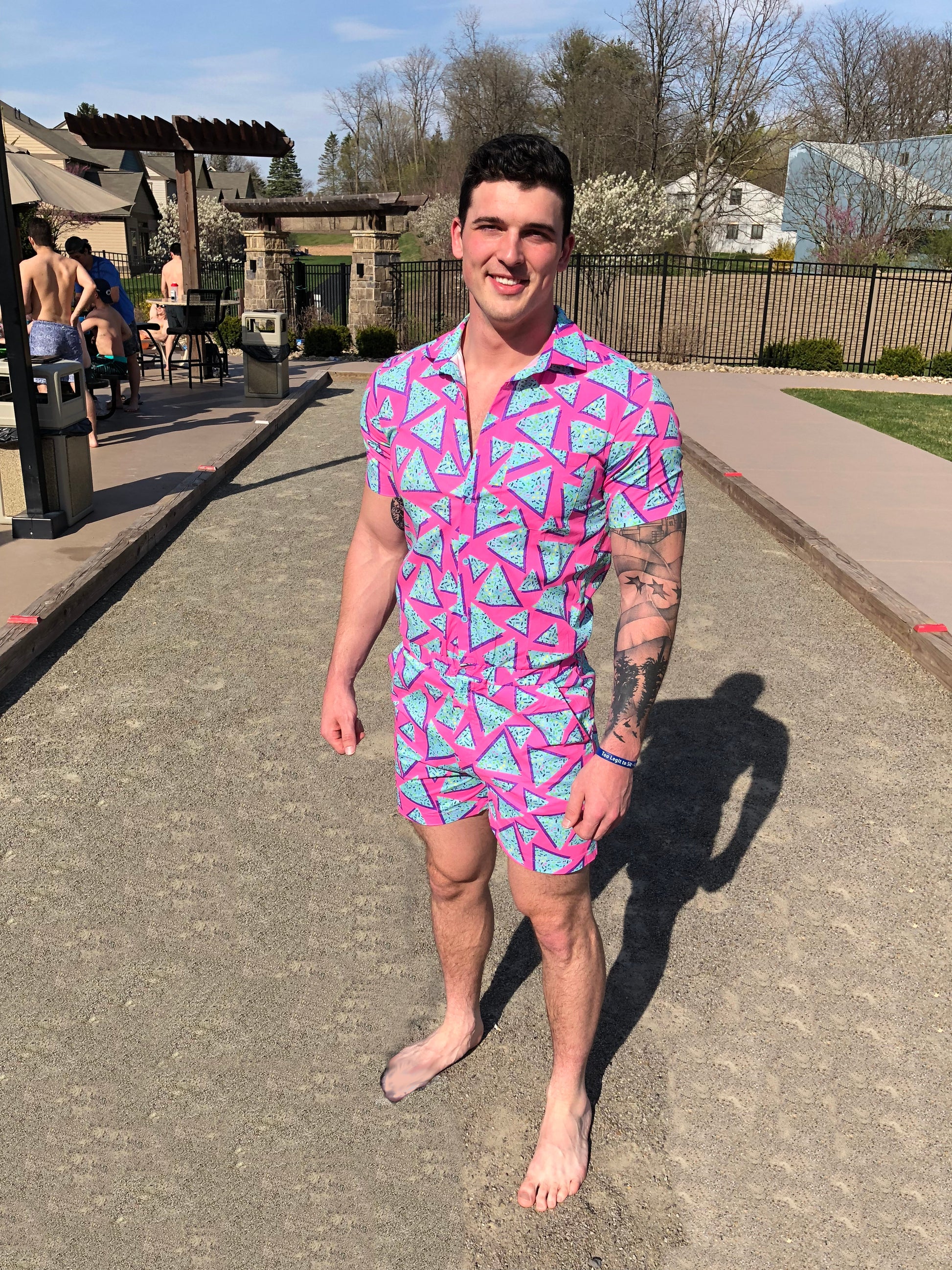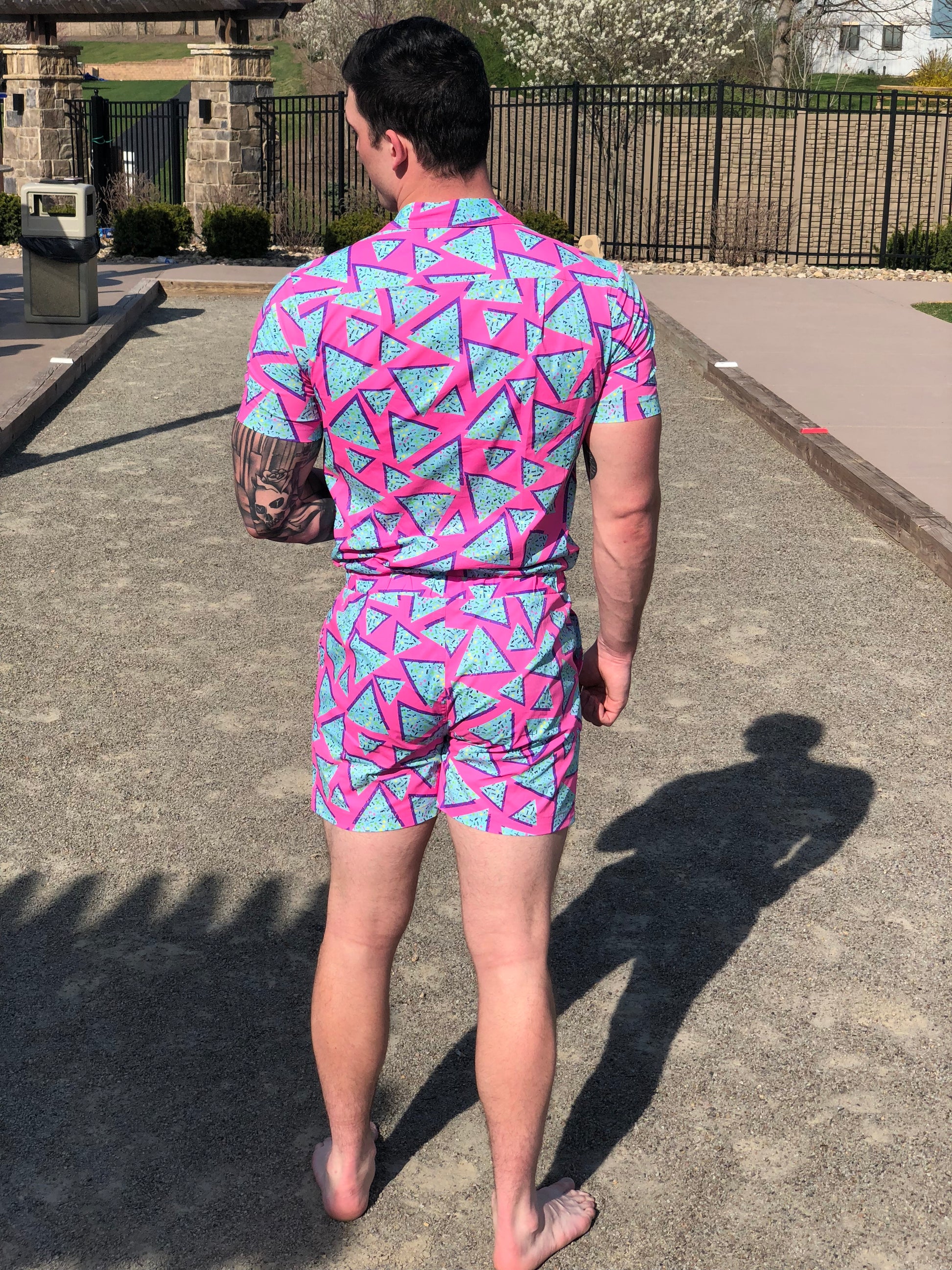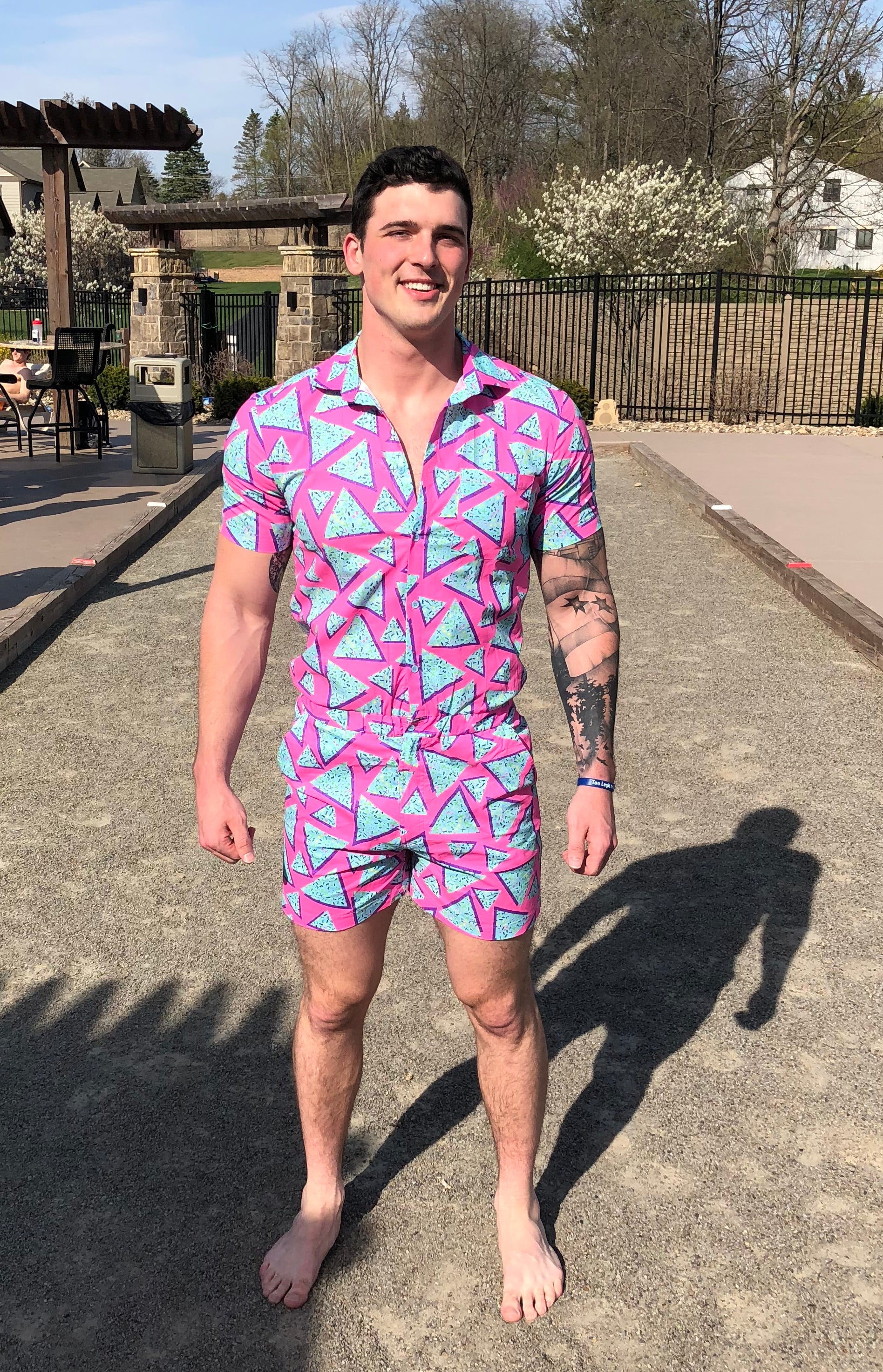 Get ready to romflex your style with this retro male romper! The playful pink triangle print offers some throwback vibes and gives you the perfect excuse to rock some good-lookin' legwear. So come on, hop on board the romper train and show the world who's boss!
