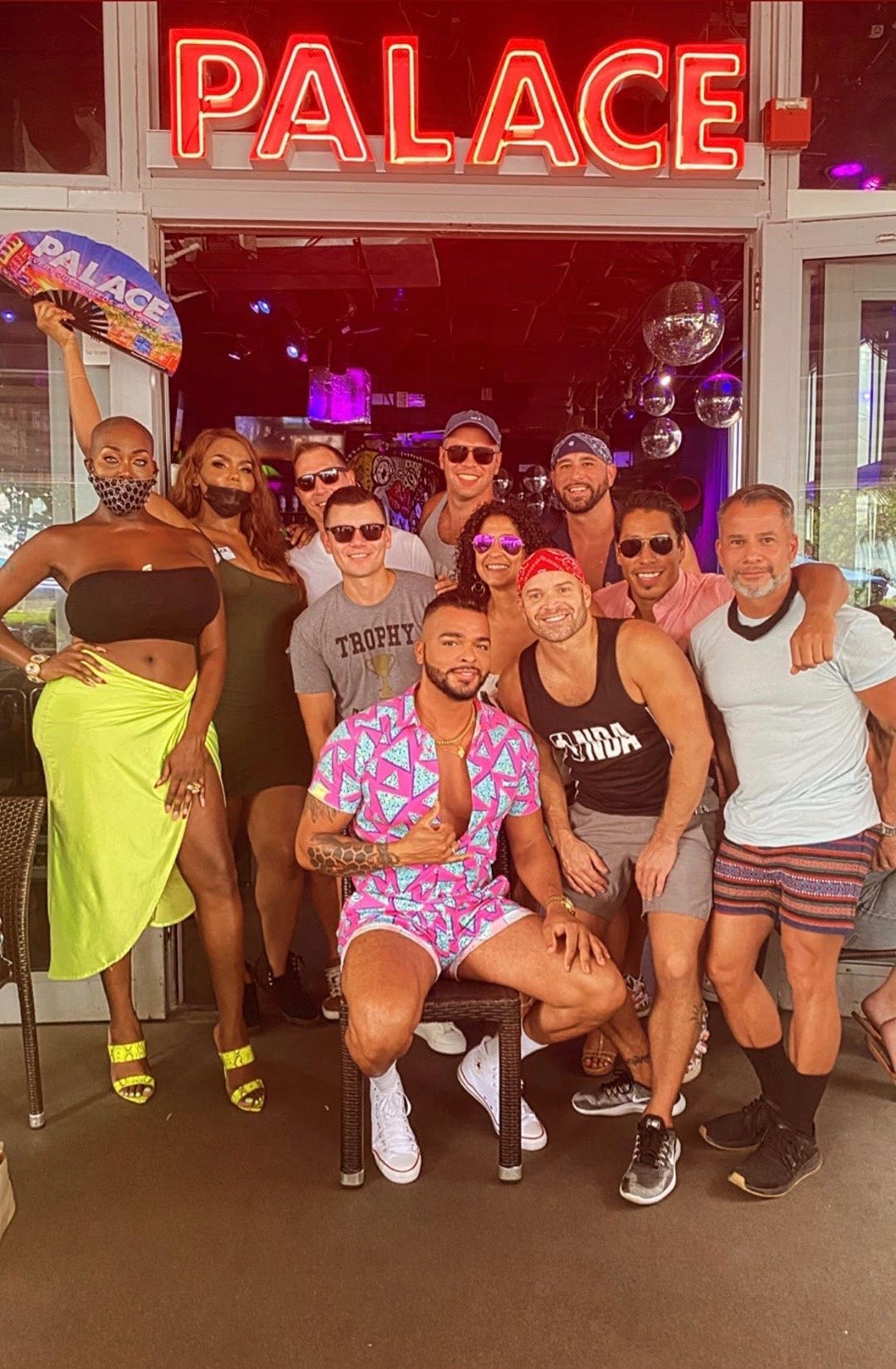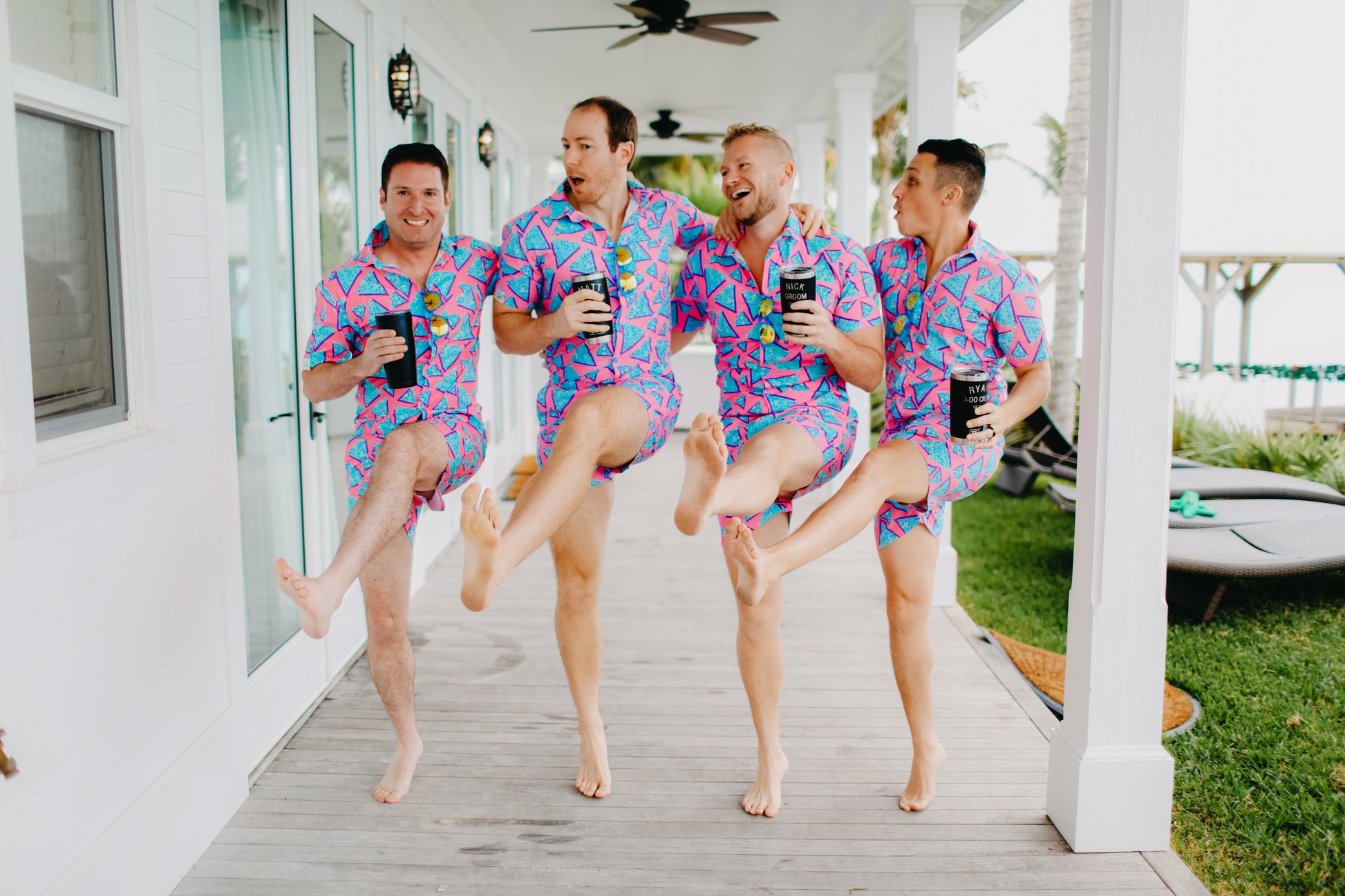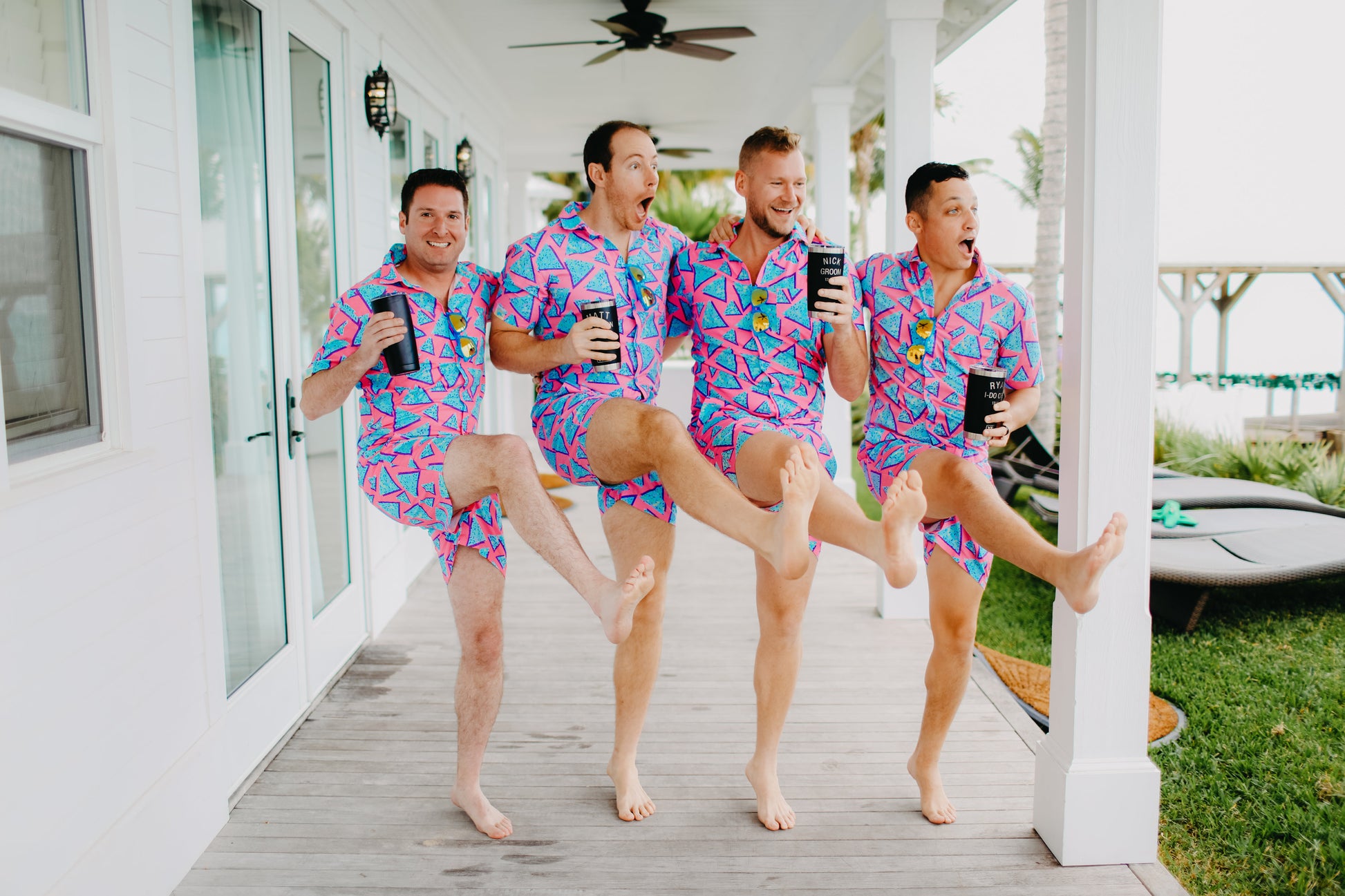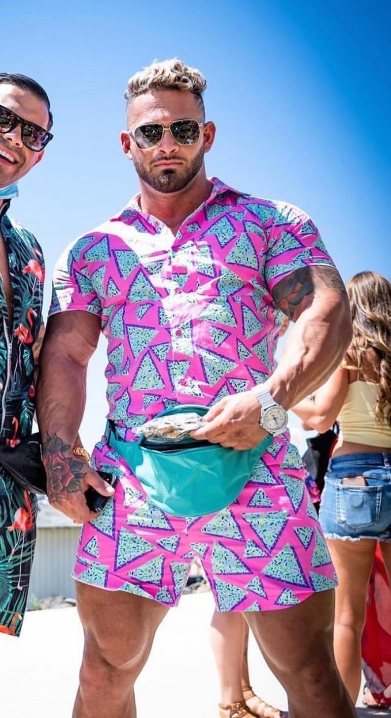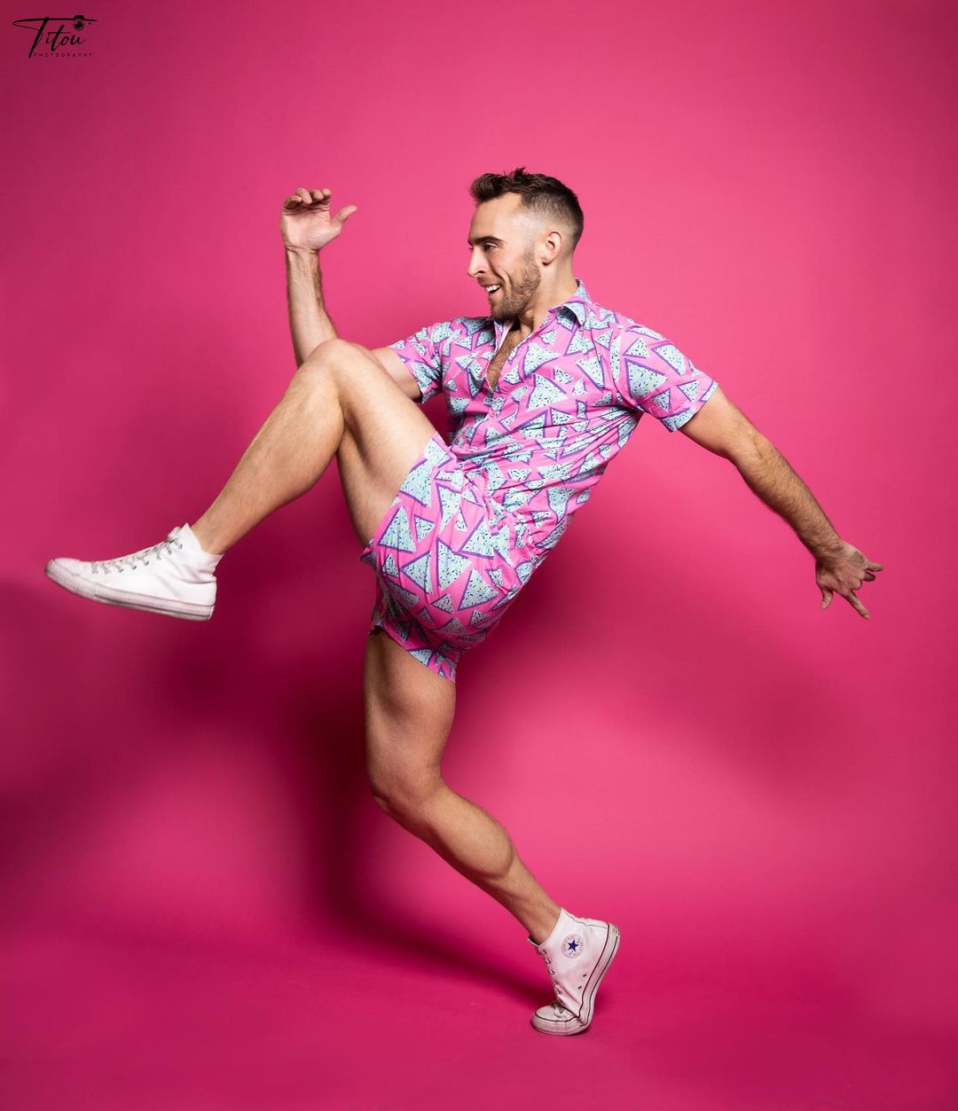 Get ready to romflex your style with this retro male romper! The playful pink triangle print offers some throwback vibes and gives you the perfect excuse to rock some good-lookin' legwear. So come on, hop on board the romper train and show the world who's boss!